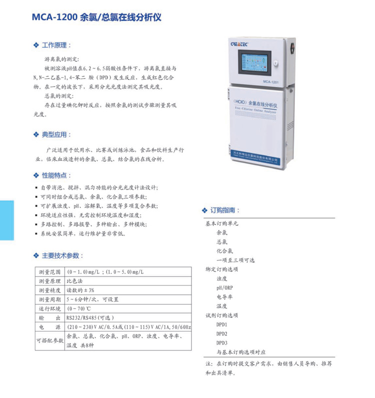 DPD法小量程余氯在線分析儀MCA-1200技術(shù)參數(shù)