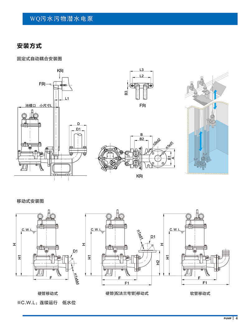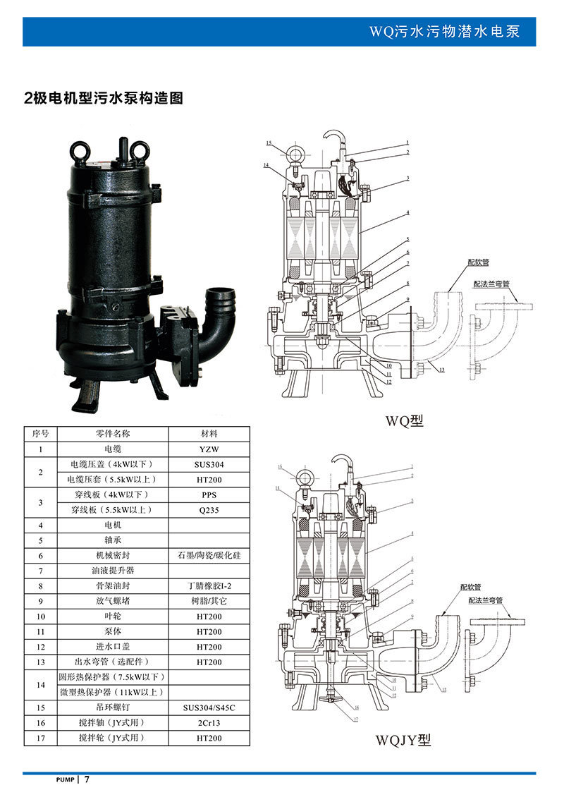 產(chǎn)品說明:南方WQ污水污物潛水電泵由電機與泵兩部分組成,兩者通過油室及機械密封組件隔開,分固定式自動耦合安裝和移動安裝。