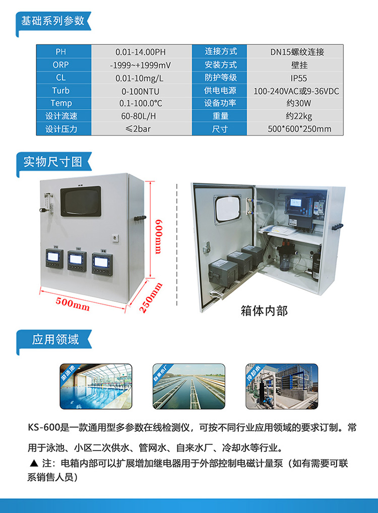 KS-600是一款通用型多參數(shù)在線檢測(cè)儀,可按不同行業(yè)應(yīng)用領(lǐng)域的要求訂制。常用于泳池、小區(qū)二次供水、管網(wǎng)水、自來水廠、冷卻水等行業(yè)。