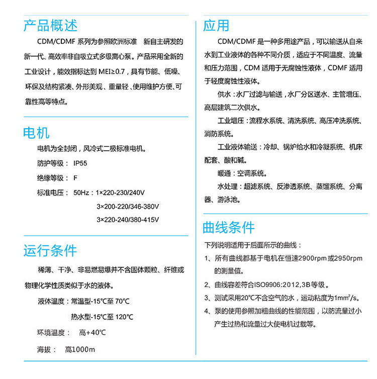 南方CDM/CDMF系列為參照歐洲標(biāo)準(zhǔn)新自主研發(fā)的新一代、高效率非自吸立式多級離心泵。產(chǎn)品采用全新的工業(yè)設(shè)計,能效指標(biāo)達(dá)到MEI≥0.7,具有節(jié)能、低噪、環(huán)保及機構(gòu)緊湊、外觀美觀、重量輕、使用維護方便、可靠性高等特點。