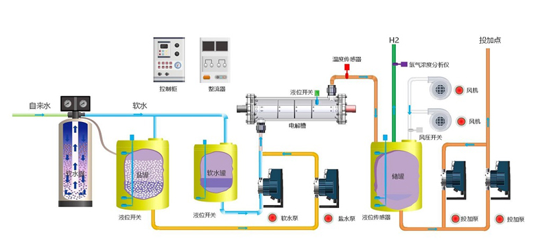 2、由軟化系統(tǒng)、軟水儲存系統(tǒng)、溶鹽系統(tǒng)、鹽水配比系統(tǒng)、供電及控制系統(tǒng)、電解系統(tǒng)、次氯酸鈉儲存系統(tǒng)、投加系統(tǒng)等系統(tǒng)組成;