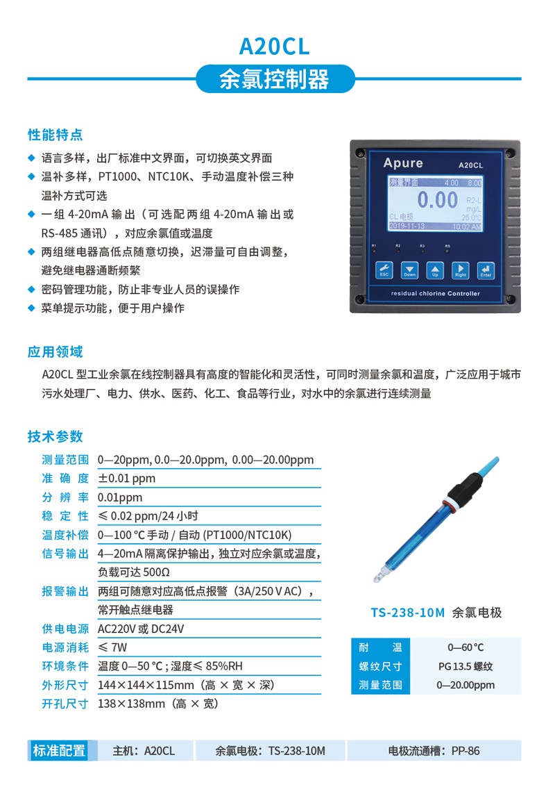 Apure余氯儀A10/A11/A20CL工業(yè)余氯在線控制器數(shù)顯臺式余氯測試儀