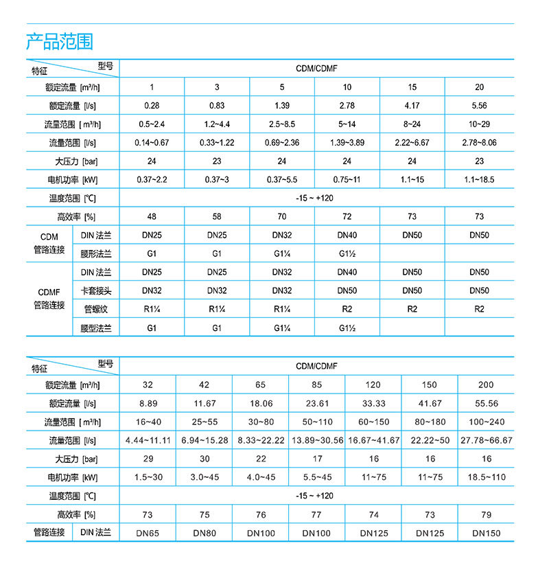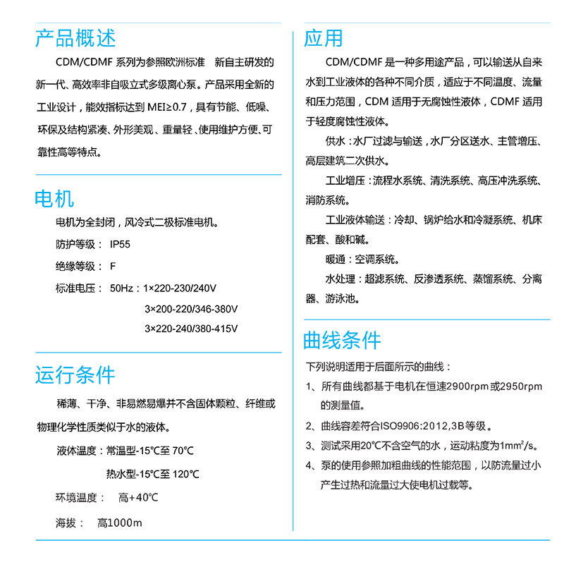 南方CDM/CDMF系列為參照歐洲標準新自主研發(fā)的新一代、高效率非自吸立式多級離心泵。產(chǎn)品采用全新的工業(yè)設計,能效指標達到MEI≥0.7,具有節(jié)能、低噪、環(huán)保及機構緊湊、外觀美觀、重量輕、使用維護方便、可靠性高等特點。