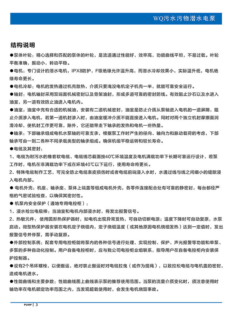 產(chǎn)品說明:南方WQ污水污物潛水電泵由電機(jī)與泵兩部分組成,兩者通過油室及機(jī)械密封組件隔開,分固定式自動耦合安裝和移動安裝。