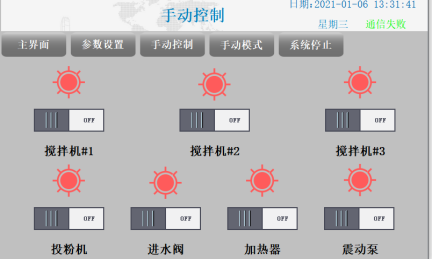 控制箱置于支架上,箱上各運轉(zhuǎn)設(shè)備及加熱件均設(shè)有“自動”與“手動”檔,當(dāng)打至“手動”時,相應(yīng)部分可由人工控制;打至“自動”時,則進入自動運行。若某設(shè)備出現(xiàn)故障時,則會報警,提醒用戶進行處理或檢修。