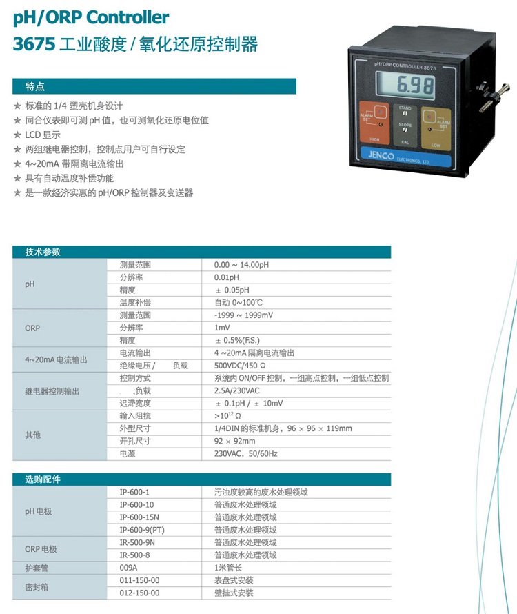 • PH/ORP變送器3675/電極IP-600-10(20米) 任氏酸度/氧化還原監(jiān)測儀