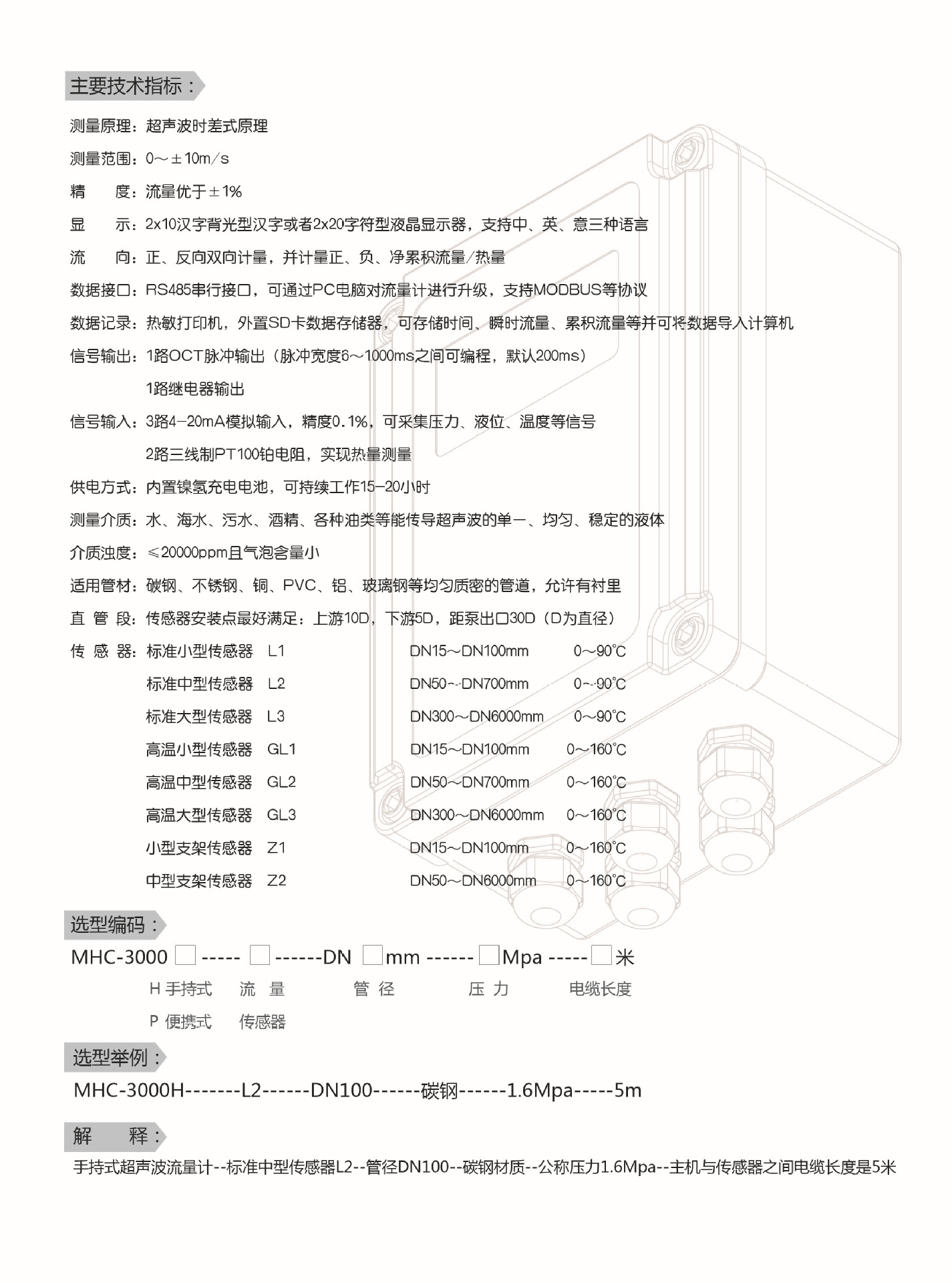 便攜式超聲波流量計水手持式管道式管壁外夾式液體傳感器