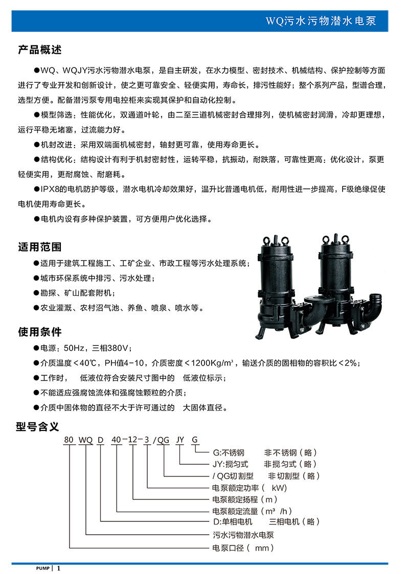 型號:潛水泵排污泵50WQ20-15-2.2JY