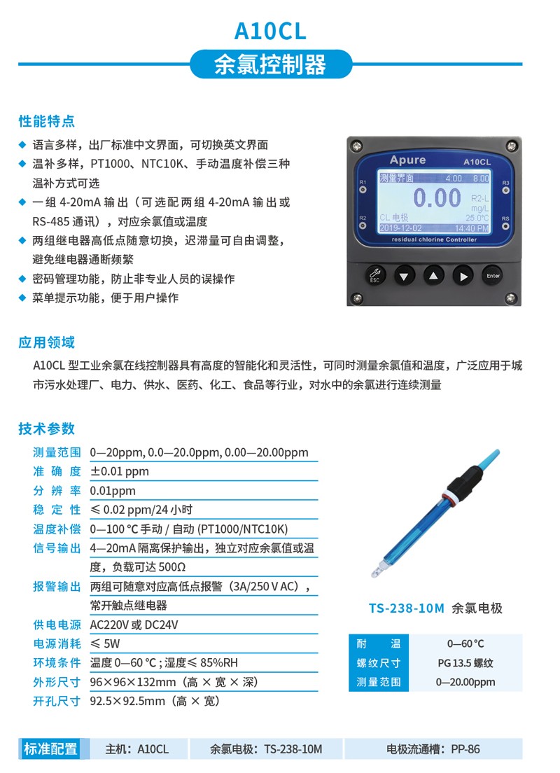 Apure余氯儀A10/A11/A20CL工業(yè)余氯在線控制器數(shù)顯臺式余氯測試儀