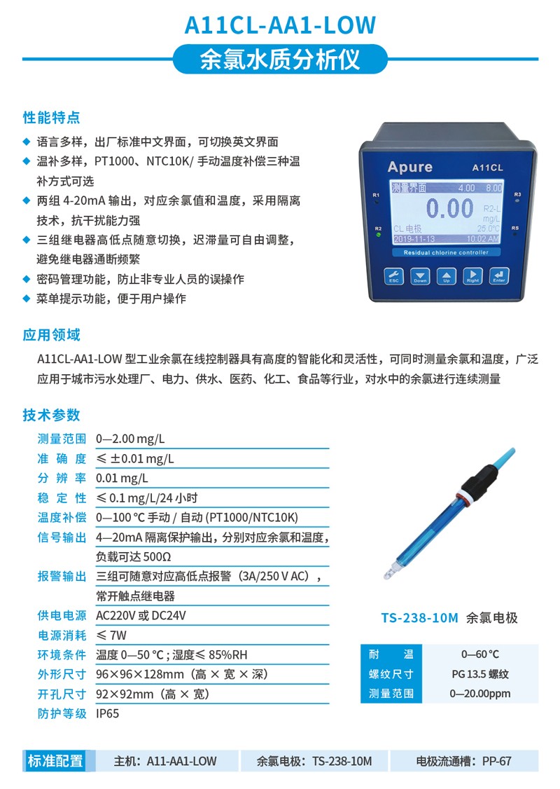 • Apure余氯儀A10/A11/A20CL工業(yè)余氯在線控制器數(shù)顯臺式余氯測試儀
