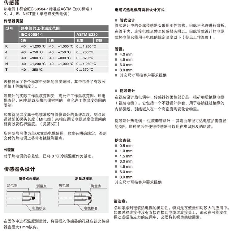 電纜式熱電偶溫度計特別適合需要直接將金屬傳探頭裝配到鉆孔(如在機械部件中)或測量過程的應用(即適用于所有不帶化學侵蝕性介質(zhì)且無磨損的應用)。要將溫度計安裝到護套中,就需要使用一個彈性卡套接頭將探頭壓入護套底部。這樣可以確保施加在探頭的力度不超過臨界值。標準型電纜式熱電偶溫度計不帶過程連接件,不過可使用螺紋接頭、活動螺母等緊固件進行連接。