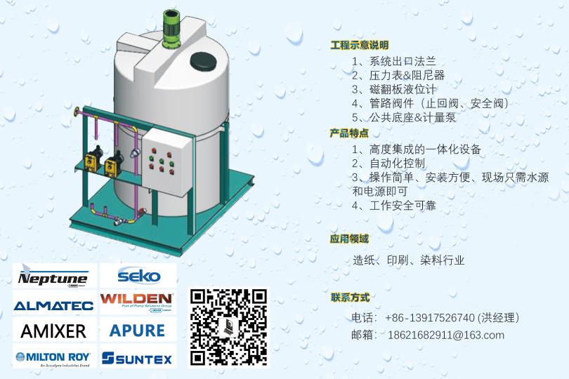 循環(huán)水加藥裝置,示蹤劑加藥裝置,遠程控制DCS加藥裝置,PAC加藥裝置,PAM加藥裝置,酸堿中和加藥裝置,冷卻塔加藥裝置,干粉投加裝置,高分子自動泡藥機,PAM自動制備系統(tǒng),絮凝劑制備系統(tǒng),PAC自動溶解混合配制裝置,純水反滲透裝置,軟化水系統(tǒng),過濾系統(tǒng),遠程控制系統(tǒng),安全閥,背壓閥,流量校正柱,管道式流量計等。